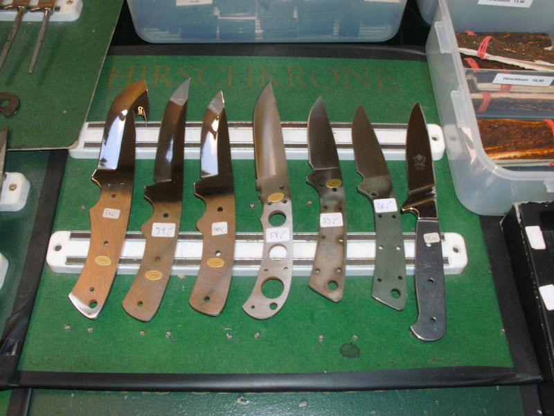 Also on display were a load of colourfully etched blades for knives to go with a traditional Bavarian attire. These are a part of German culture and serve as a snack knife to be carried in the "Lederhose" (leather pants). In that, they can be compared to the Scottish Sgian Dubh. The term "Jagdnicker" comes from the German hunting jargon term "abnicken", which means, to stick the neck of a wounded deer to kill it by severing the spinal nerve system fibres. In that, it is a hunting knife per definitionem. Another cultural aspect is the "Brotzeit", a traditional platter of snack items, which is served mainly on a wooden board in the "Biergarten", where traditionally no table cutlery would be provided (nowadays it is, of course!), and one had to use one´s own knife (and sometimes fork) to skew bacon, radishes, cheese, pickled cucumber, and spread mustard and "Kren" (a paste of hot horse radish, cream and sometimes apple) on the meat and cheese. A competition in `em days;-) as well as nowadays is who can carve the finest accordeon decor from the "Radi", a white radish, which is sprinkled with salt and sometimes pepper. The "Brotzeit", in that, is more of a ritual, and involves a good deal of drinking, too, "Weissbier" and schnapps alike, and a good deal of showing off the knife, which is often decorated far beyond practicability. The knife is the pride of any true Bavarian, and older versions are to be found decorated with scales of ebony, intarsia in mother-of-pearl, silver, and even gold, but those are rare. I hope I can do a post on the kind of knife sometime soon, for it is a very interesting topic for sure.